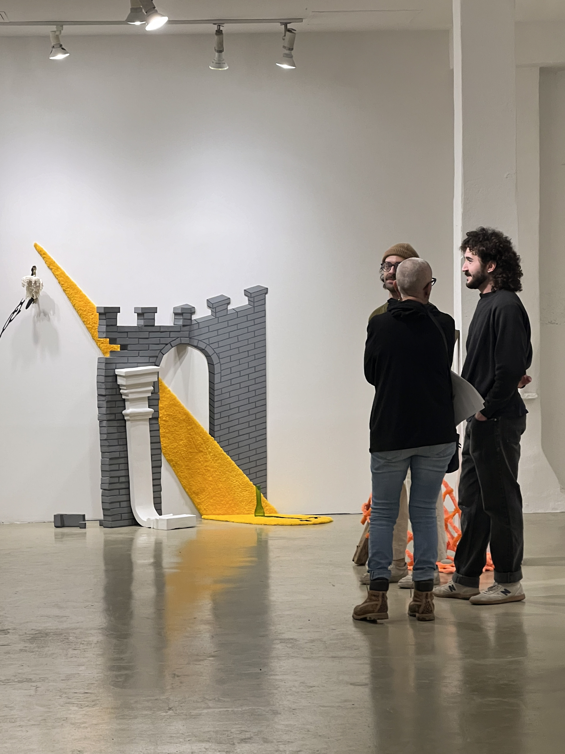Matthew Gilbert’s pictorial rugs and set-like installations depict an abandoned world that combines medieval architecture with contemporary imagery. Their work articulates anachronistic timescales, comparing a drip of a candle to a sagging doric column. By placing modern symbols within Gothic wreckage, Gilbert collapses the timeline of human history, arguing that we as a species are a mere blip in the lifespan of Earth. Long after we make this planet uninhabitable for our species, nature will continue to evolve and adapt. The cartoonish quality of the work suggests an irreverence to the otherwise catastrophic subject matter, adding a comedic undertone. Drawing inspiration from the sets of German expressionist films, their installations project the feeling of loneliness and yearning onto architectural forms. Spikes and chains allude to queer fetish aesthetics. Oblique shadows are illustrated with black paint and construction paper, heightening the anxiety within their work. Found objects and fabricated materials blur the distinction of real and imagined. Oscillating between the second and third dimensions, distorting perspective and scale, Gilbert’s work finds meaning between binaries.